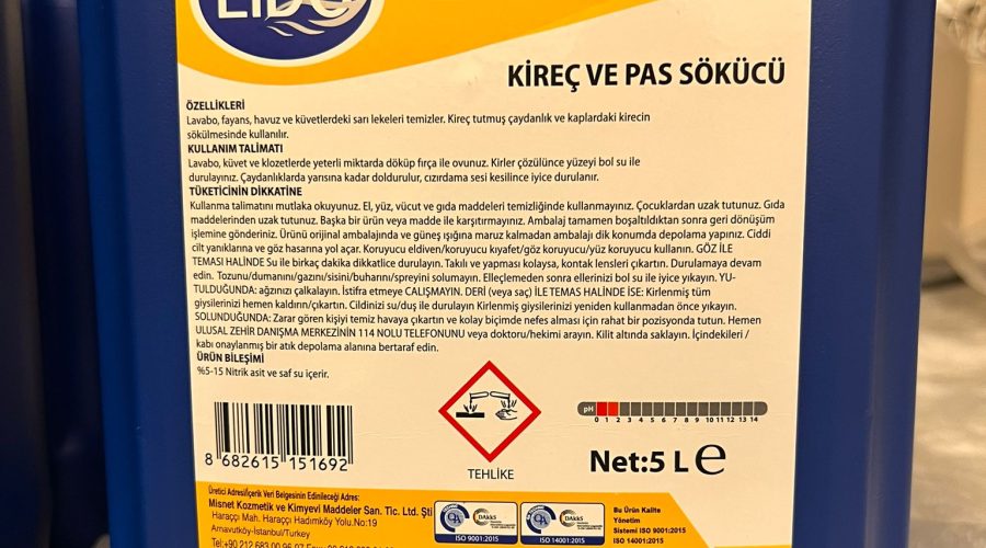 Ürün adı Lido Pas ve kireç çözücü Markası Misnet Etken maddesi Nitrik asit Kullanım şekli Paslı kireçli yüzey temizliğine uygun yüzey temizleyici Tipi ve özelliği Tahriş edici Miadi Açılış tarihi itibariyle son kullanım tarihi baz alınır. Saklama koşulları Normal depo koşulların da saklanır. Maruz kalma yolu Göz teması, deri teması, solunum yolu. Sağlığa zararlı etkisi Ciltte Aşınma/Tahriş, Zararlılık Kategorisi Etkileşime girdiği maddeler Asitler. Temas halinde müdahele Temas olduğunda su ile yıkanır. Taşıma şekli ve önlem Kişisel koruyucu donanım. İmha yöntemi Tehlikeli atık yönetmeliğine göre bertaraf edilmelidir. Kanalizasyona karışmamalıdır. Tehlikeli atık kodu 150110 Kullanılması gereken kişisel koruyucu donanım Koruyucu eldiven/koruyucu kıyafet/göz koruyucu/yüz koruyucu kullanın. Yangın söndürmede kullanılcak yöntem Toz, alkole dayanıklı köpük veya karbondioksit (CO2). Konteynerleri soğutmak için su kullanılabilir. Maruz kalma süresi – Tehlikeli madde sınıfı görseli Daha fazlasını görüntüle (PDF)